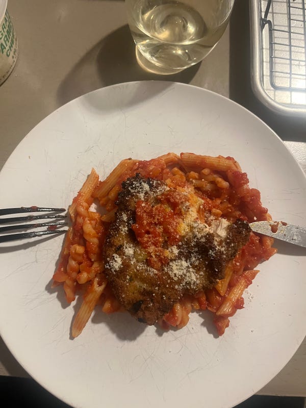 Eating chicken Parm.